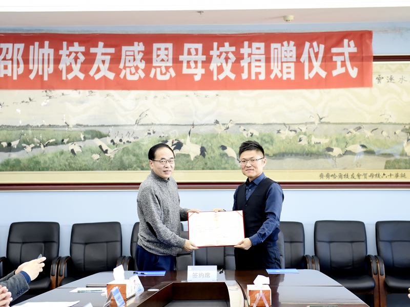 12月20日上午,哈尔滨校友会秘书长、黑龙江省鑫隆科技有限公司总经理邵帅校友(管理03级)感恩母校捐赠仪式在教学主楼第二会议室举行。哈尔滨校友会会长、哈尔滨海德电子有限公司总经理于志超(计算机85级),哈尔滨校友会资深校友、黑龙江省政府教育督导办原副主任李传威(管理83级),哈尔滨校友会资深校友、黑龙江省政府教育督导办督学袁伟(计算机83级)及我校校长周宏力、副校长刘胜辉及相关公司、职能部处领导出席仪式,捐赠仪式由校友办主任董传友主持。