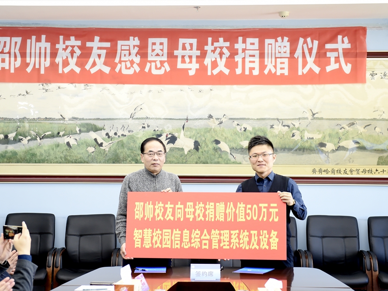 邵帅校友系我校工商管理专业2007届毕业生,先后担任大庆市伟业电脑科技有限公司总经理,黑龙江省鑫隆科技有限公司总经理,现为中国声光视讯工程商联盟黑龙江副秘书长、中国演艺设备技术协会会员、中国青年企业家协会会员。本次捐赠的智慧校园信息综合管理系统及设备,可实现全校LED屏、电子展板和智能班牌等设备的一体化管理,可与录播系统及虚拟校园电视台相连,动态展示教学课程、校园招聘等信息,为更好地推动我校智慧校园建设奠定了良好的基础。