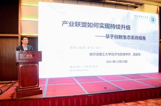 在主题报告环节,武建龙院长基于创新范式从“创新体系”向“创新生态系统”的变革趋势,作题为“产业联盟如何实现持续升级—基于创新生态系统视角”的主题报告。该报告主要围绕产业创新范式转换的时代背景,阐释了我国数以千计的产业联盟的组织优势、创新压力以及持续创新发展的深层次困境,提出产业联盟创新生态系统的“竞争”与“继承”并存的升级本质。报告以我国2G、3G、4G、5G创新生态系统的长周期演进为例,系统全方位地向与会者分享了产业创新生态系统的内涵、特征、结构、演进过程、演进动力以及演进速率。结合中国创新实践,以TD产业联盟、农业装备产业联盟和闪联产业联盟为例,揭示了产业联盟创新生态系统的竞争性驱动、继承性驱动、需求拉动、政策引导的代际升级动力机制,凝练设计了产业联盟创新生态系统多样化升级路径,并为我国产业联盟创新管理与政府部门创新政策制定提供建议。