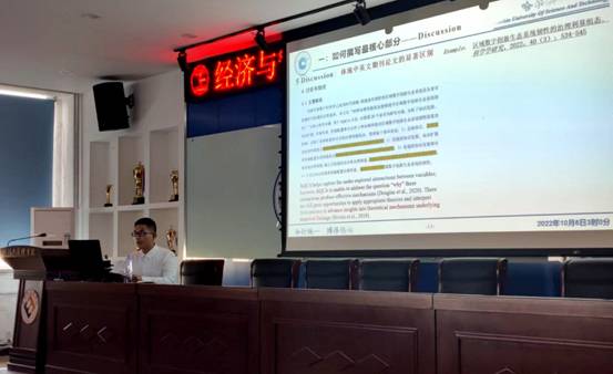 赵天一同学从选题背景和论文基本内容、组态思想与QCA方法应用、论文修改和发表经验三个方面展开分享,并阐述了引言、文献综述、讨论和贡献等部分的写作技巧和审稿重点。如,在引言部分,介绍了5C框架及其应用;在综述部分,指出了只综不述、全而不精、观点杂糅、缺少作者身影等常见问题及应对技巧;在讨论及贡献部分,通过对比中英文期刊的区别,阐述了Discussion的主要功能、Theory的多层含义、Contribution的类型及提升路径等。最后,赵天一同学分享了期刊选择、投稿、返修等环节的注意事项,并表达了对导师王宏起教授悉心培养的感激,以及对公司学科建设的良好祝愿。