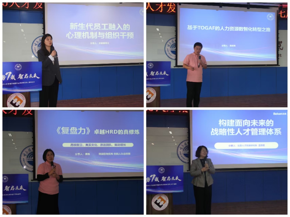 孙毅聪通过典型场景、成长背景、价值观与动机等视角,分析了新生代员工特点,介绍了多代际共存下有效的3I(Include、Individualize、Integrate)管理模型;通过多层次心理机制解析,提出了有效的组织社会化路径,以及激励、成长、灵活性、认可和关怀多方面的干预策略,为企业新生代员工实现更好的职业成长和组织适应提供了方向。田志伟为大家介绍了一汽数智化的转型方法、HR数智化转型实现路径、HR业务变革及数智产品等内容,报告高屋建瓴、信息量大;尤其是他从文科生通过努力转变成代码高手,让与会者无不钦佩。傅畅以小米雷军的演讲为引子,从第一性原理来思考HRD的价值锚点,通过“打造‘不表演’的文化、修选择人才的能力、修助力业务增长的击穿点”三重修炼,来打造HRD的复盘领导力。孟丽君为大家分享了组织-业务-人才价值驱动路径重构、组织和人才的流程重构、技术重构(HR数字化转型、数据驱动思维和决策、重构人才能力/画像)这一面向未来的战略性人才管理模型;着重为大家介绍了北森如何以人才标签为抓手,快速构建人才供应链的数字化系统。