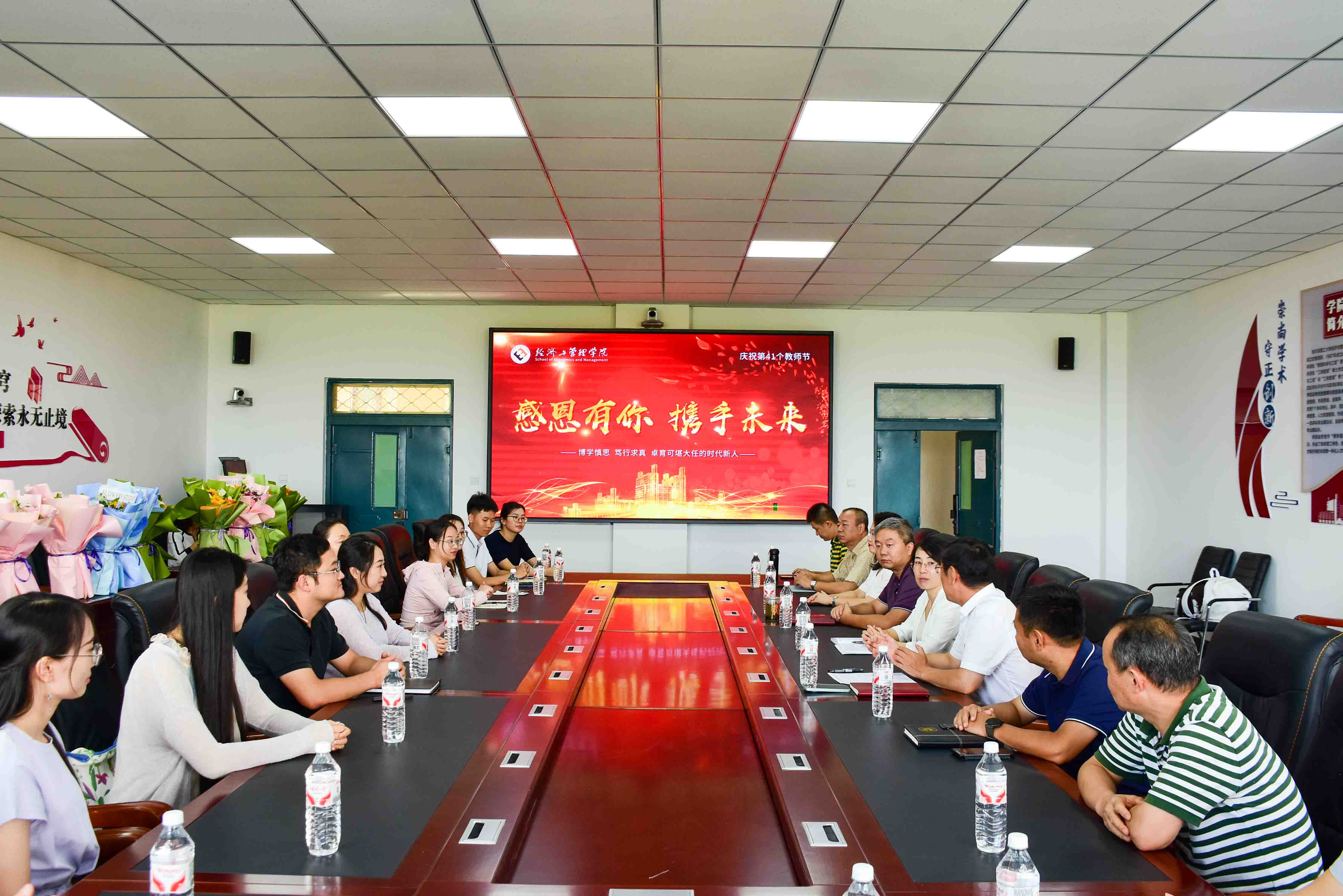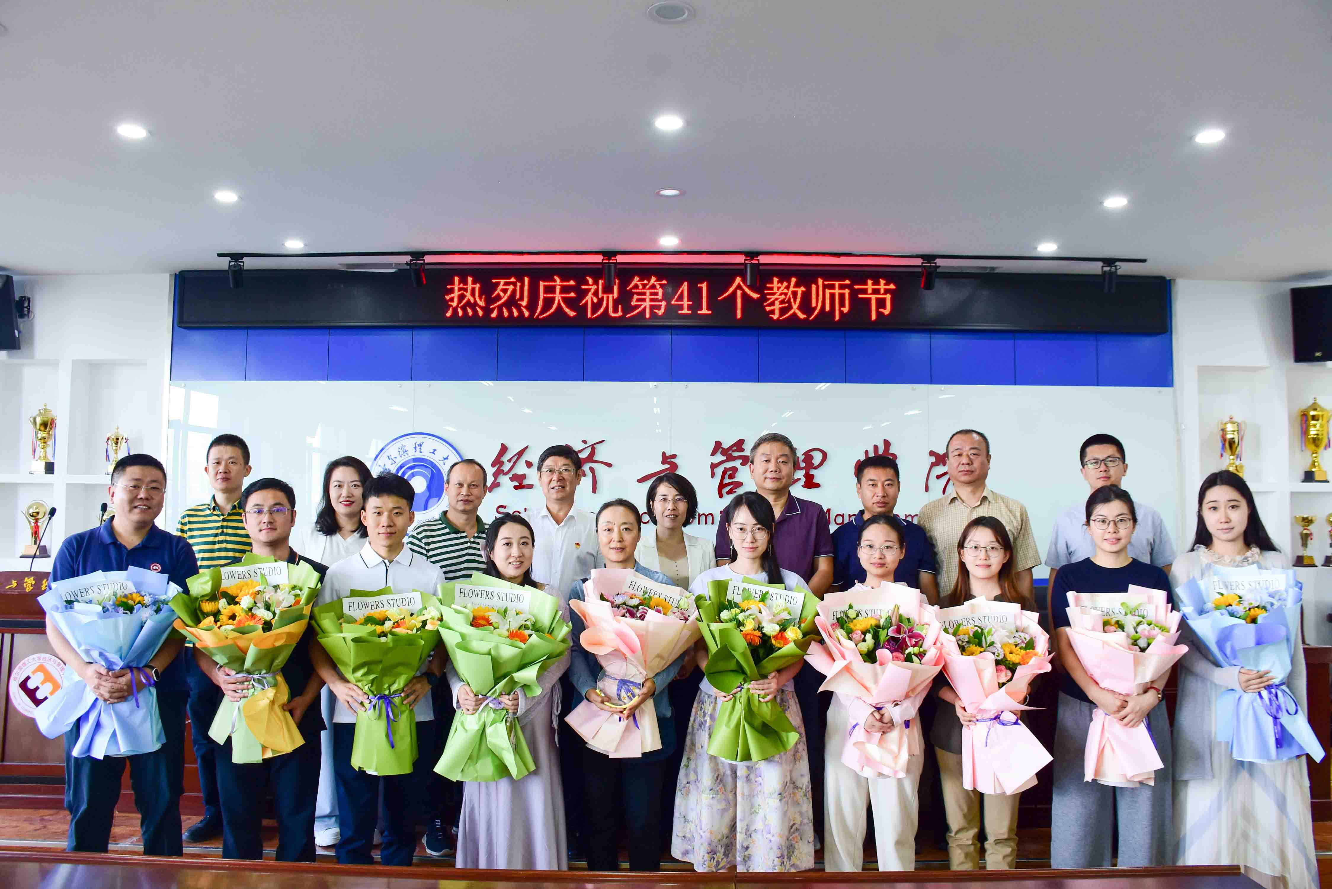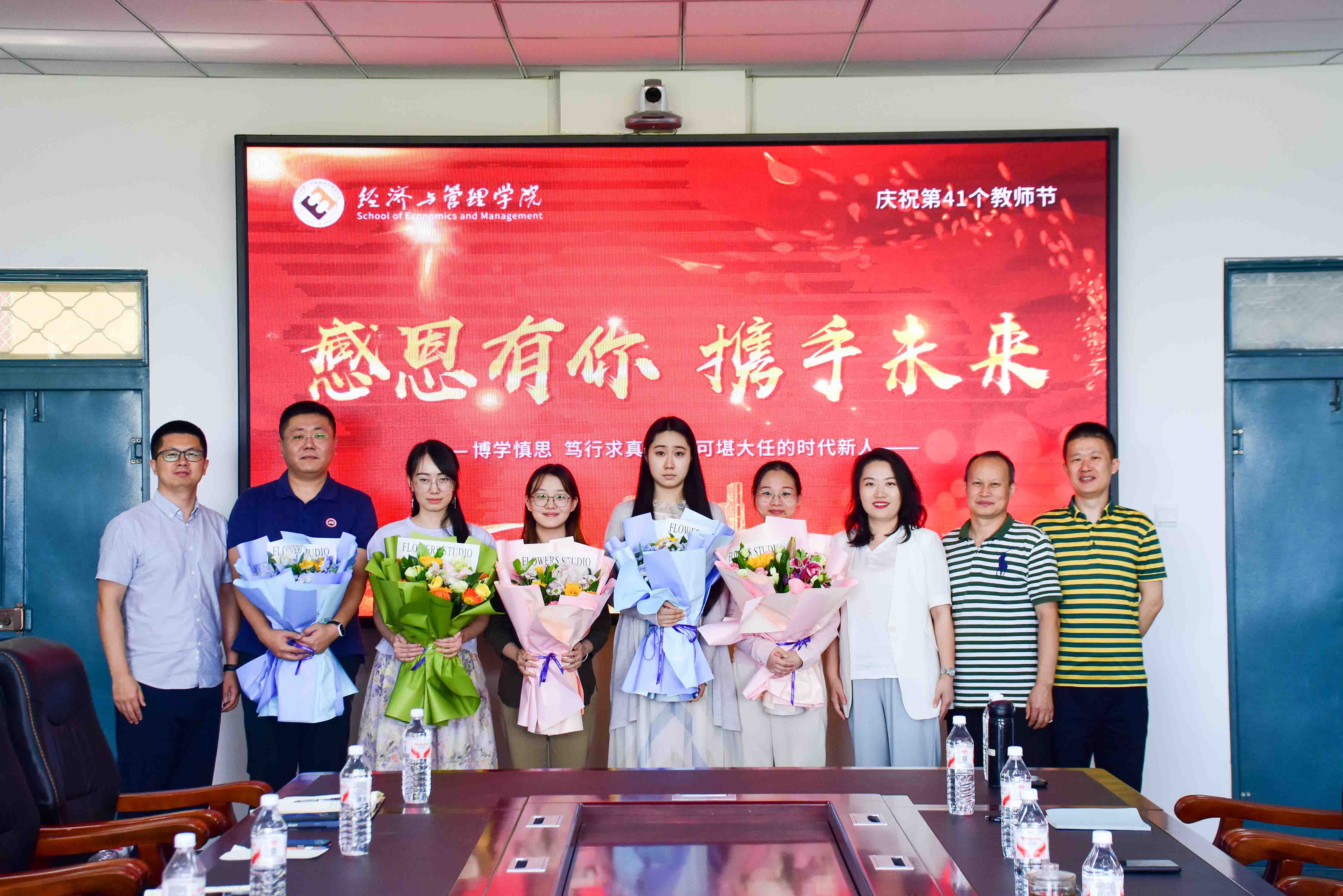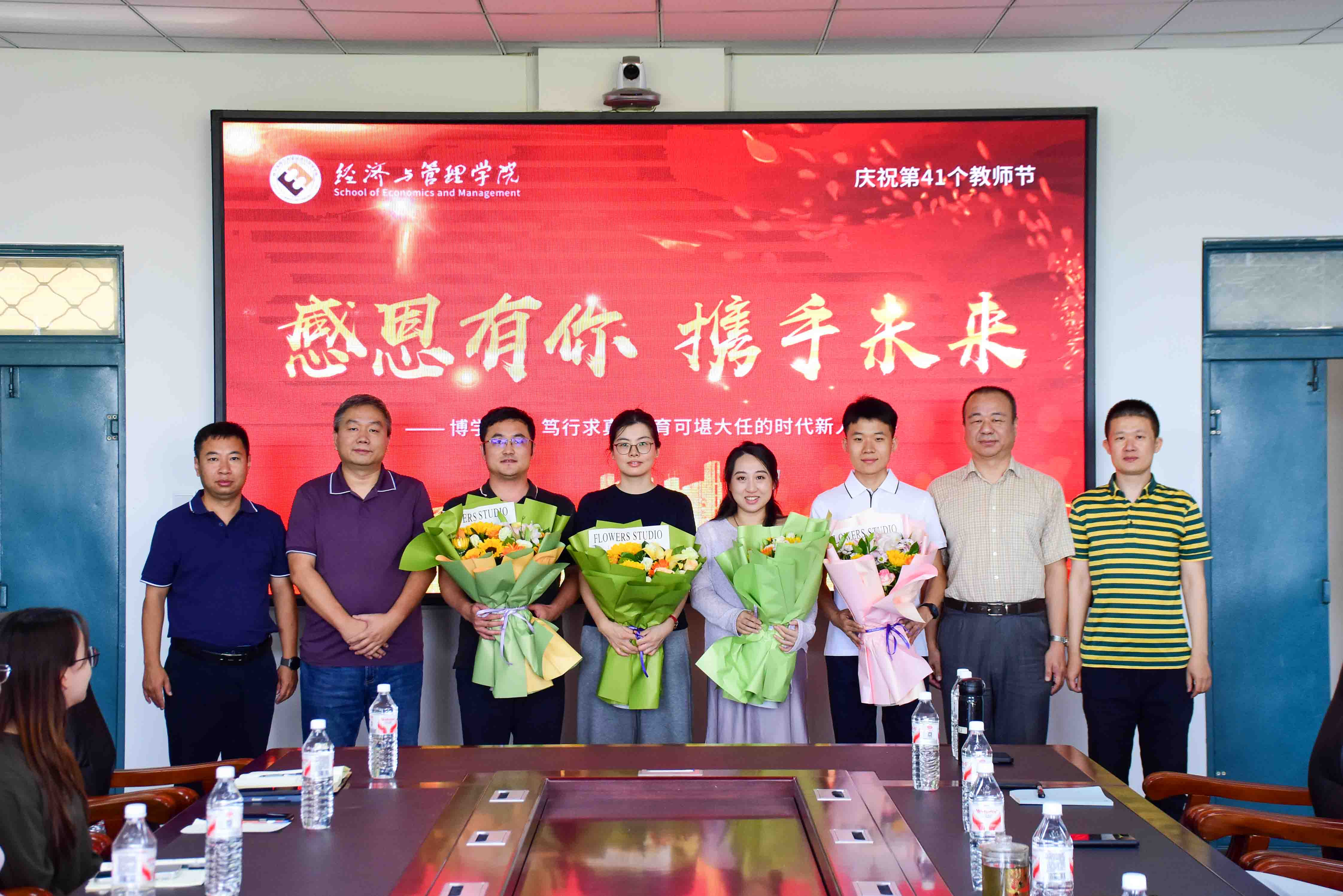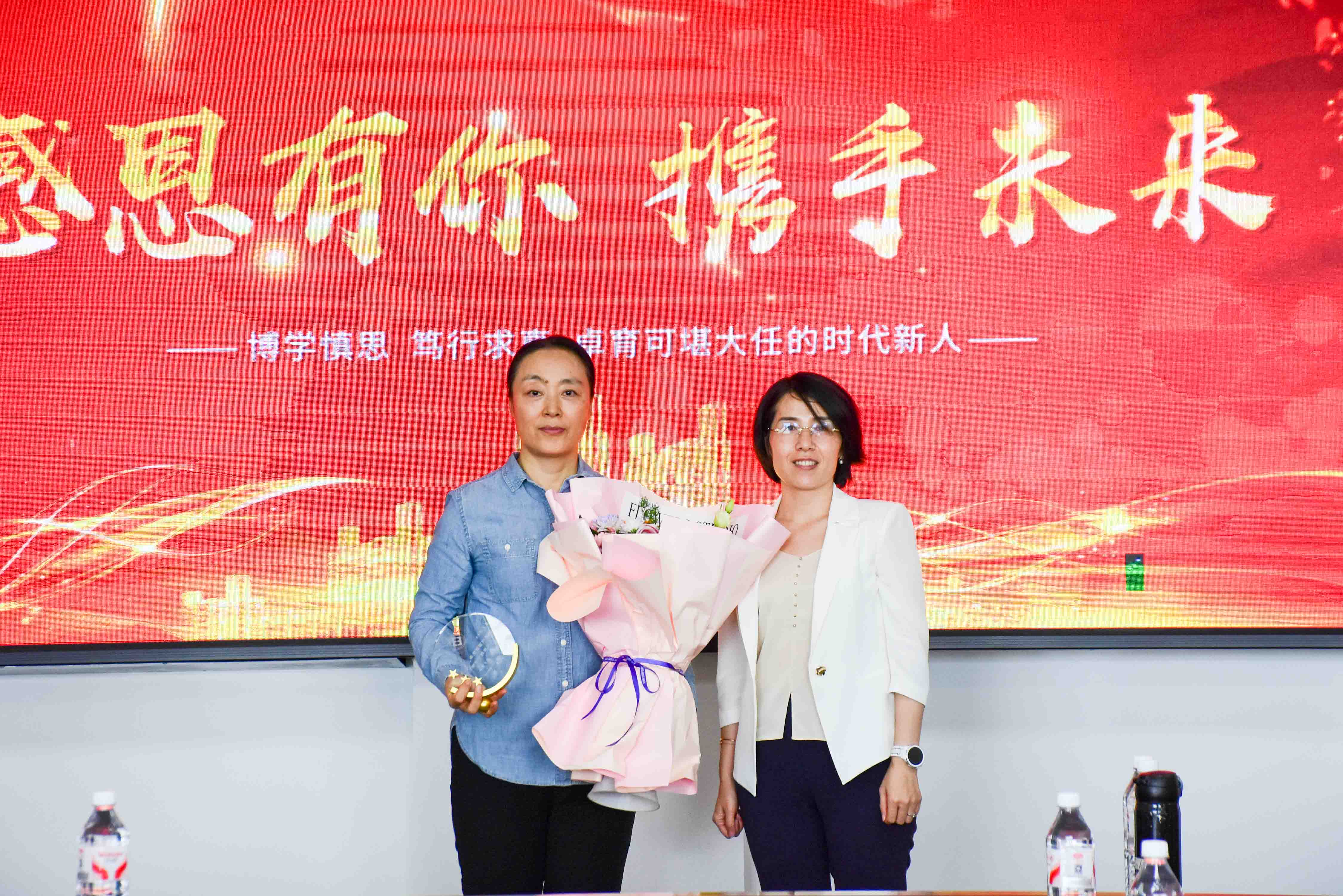 院长王莉静为荣休员工代表翟东晖老师敬献鲜花并颁发刻绘“感恩有你 携手未来”的荣休纪念牌,向老员工们为公司发展做出的突出贡献致以崇高敬意;党委副书记郭宝鹏,副院长姚锋敏,系主任蒲明、康鑫、徐莹、杨仲基、周艳山为于金闯、孙毅聪、金姝彤、黄佳赛、高野、李佳楠、刘佳欣、杨雪婷、关鑫航9位新入职员工献上鲜花,全体参会人员以热烈的掌声向老师们送上美好祝福。