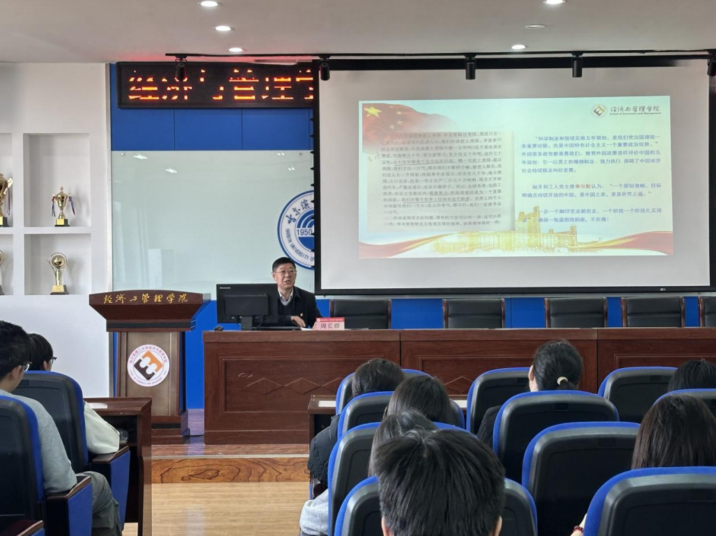 宣讲会上,周长群以党的二十届四中全会召开的历史方位与时代背景为切入点,从深入学习领会习近平总书记在全会上的重要讲话精神、深刻认识全会的重大意义、深刻领会“十五五”时期经济社会发展的指导方针和主要目标等方面对全会精神进行了解读。他指出,党的二十届四中全会是在我国全面建设社会主义现代化国家关键时期召开的一次十分重要的会议,明确了“十五五”时期经济社会发展的指导方针和主要目标,擘画了未来五年发展的宏伟蓝图,为深入推进中国式现代化指明了前进方向、提供了根本遵循,也为当代青年成长成才、担当作为提供了行动指南。他强调,高校是立德树人的主阵地,员工党员是青年群体中的先进分子,要带头学深悟透全会精神,深刻把握“国之大者”,把个人的理想追求融入党和国家事业发展大局。同时,他对全体员工党员提出了三点明确要求:一是要筑牢政治忠诚,始终把政治建设摆在首位,深刻领悟“两个确立” 的决定性意义,增强“四个意识”、坚定“四个自信”、做到“两个维护”,始终在思想上政治上行动上同以习近平同志为核心的党中央保持高度一致;二是要强化理论武装,把学习贯彻全会精神作为首要政治任务,制定系统的学习计划,读原著、学原文、悟原理,做到学思用贯通、知信行统一,真正把理论学习成果转化为坚定的理想信念;三是要勇担时代使命,立足经管学科专业优势,在专业学习、科创竞赛、社会实践中锤炼过硬本领,努力成长为懂经济、善管理、有担当、能奉献的高素质复合型人才。