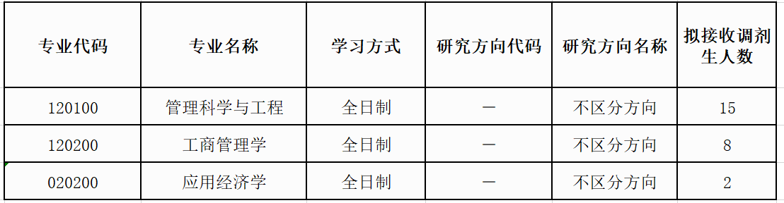 2026年,437必赢会员中心管理科学与工程(学科代码120100)、工商管理学(学科代码120200)、应用经济学(学科代码020200)接收调剂生,各方向招收调剂人数下表。
